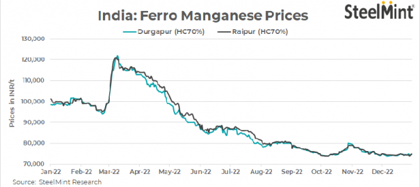 MOIL will conduct an auction for 1,700 t of high-carbon (HC) ferro manganese of 63-72% grade, 1,700 t of ferro manganese slag and 2,975 t of manganese ore of dioxide grade on 11 Jan’23 from its Bhandara mines and Balaghat plant. Domestic ferro manganese (HC70%) prices were at around INR 74,700-75,000/t exw from both Durgapur and Raipur on 30 Dec’22, as per SteelMint’s assessment.