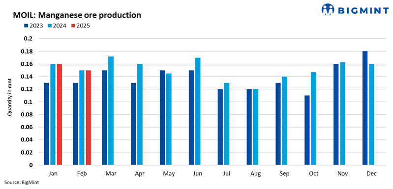 MOIL’s manganese ore production in Feb’25 stood at 0.15 mnt, showing no change compared to Feb’24. Additionally, in Apr-Feb’25 sales totalled 1.43 mnt, a 3% increase from the previous year.