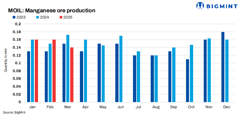 MOIL’s manganese ore production for FY’25 (Apr’24-Mar’25) touched 1.80 mnt, reflecting a 2.7% y-o-y growth. Additionally, sales totalled 1.58 mnt during this period, a 3% increase from the previous year. Moreover, company’s ferro manganese production stood at 12,000 t, spiked by 18% y-o-y.