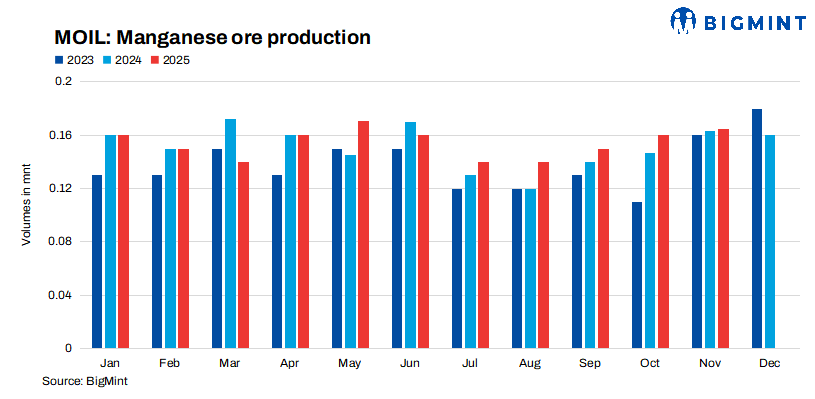 MOIL registered a modest 1% y-o-y increase in manganese ore production in Nov’25, reaching 0.165 mnt, while sales rose to 0.137 mnt, marking 3% y-o-y growth. Moreover, during Apr–Nov of FY’26, the company delivered 1.269 mnt of output, reflecting a robust 8% rise compared to the previous year.