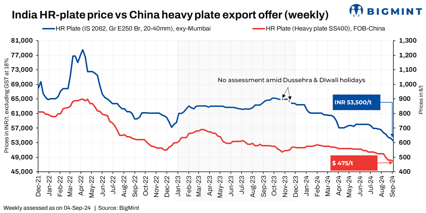 BigMint’s weekly assessment for HR plates (IS2062, Gr E250 Br, 20-40mm) was around INR 52,000-55,500/t ($619-661/t) exy-Mumbai as of 4 September 2024, down by INR 700/t ($8/t) w-o-w.