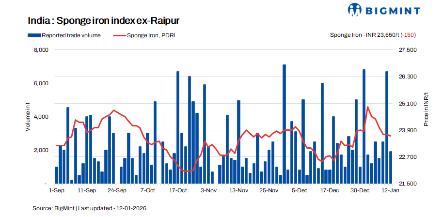 Sponge iron prices across major Indian markets declined by INR 50-400/t d-o-d on 12 January 2026, as weak market sentiment persisted amid subdued demand for finished steel. The soft downstream demand environment continued to weigh on sponge iron procurement, resulting in muted trading activity across regions.