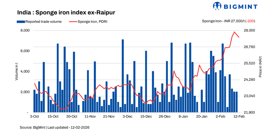 Sponge iron prices across India declined by between INR 100-450 per tonne day-on-day on 12 February, as weak market sentiment persisted amid subdued demand for finished steel. The soft demand environment continued to weigh on sponge iron procurement, keeping overall trading activity muted.