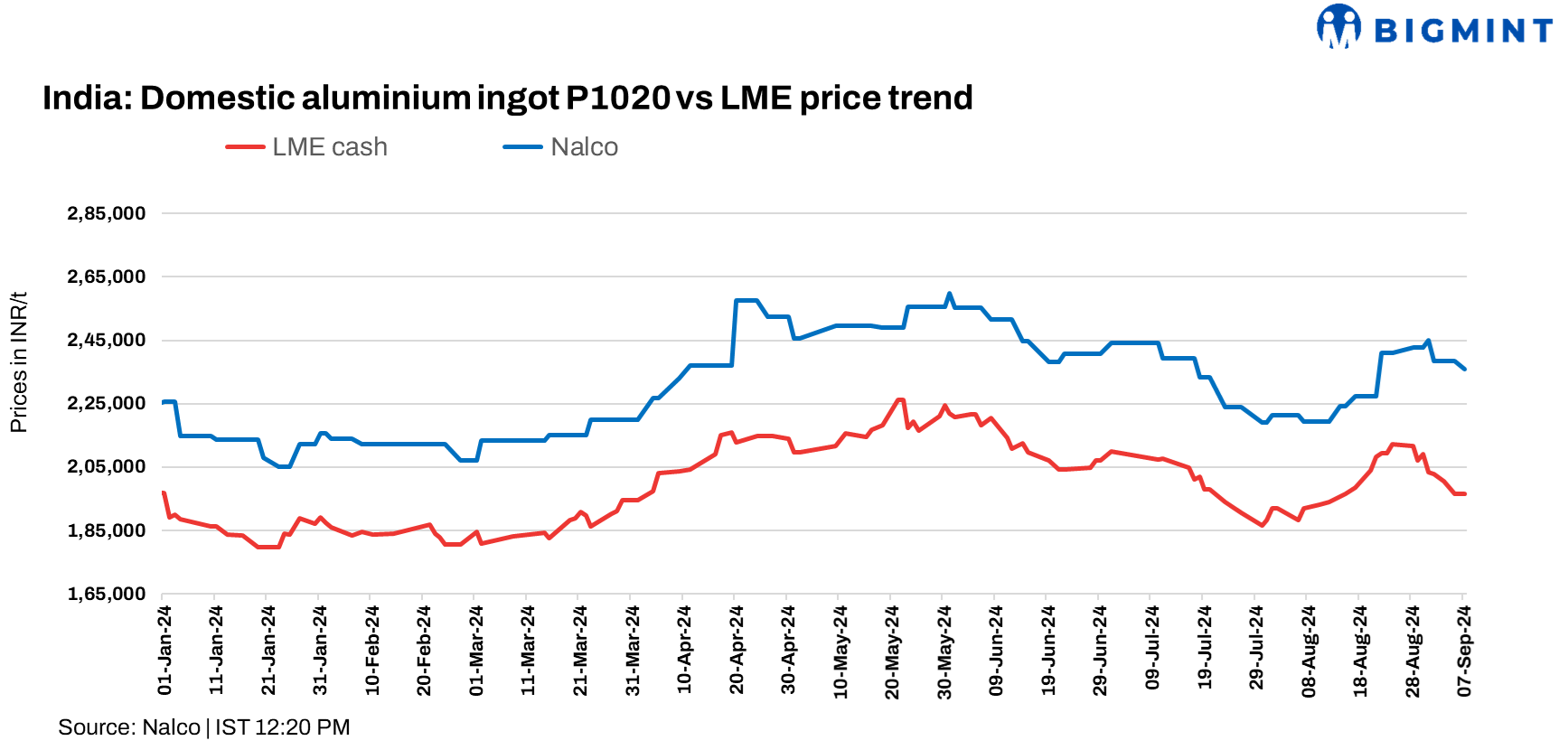NALCO reduced prices of primary aluminium ingots P1020 (99.7%) by INR 2,600/t ($30/t) on 7 Sep’24. Post-revision, NALCO’s prices stood at INR 233,500/t ($2,809/t) compared to INR 236,100/t ($2,840) on 1 Sep’24. Prices are ex-works and exclude GST. At the time of reporting, aluminium futures on the LME stood at $2,342/t.