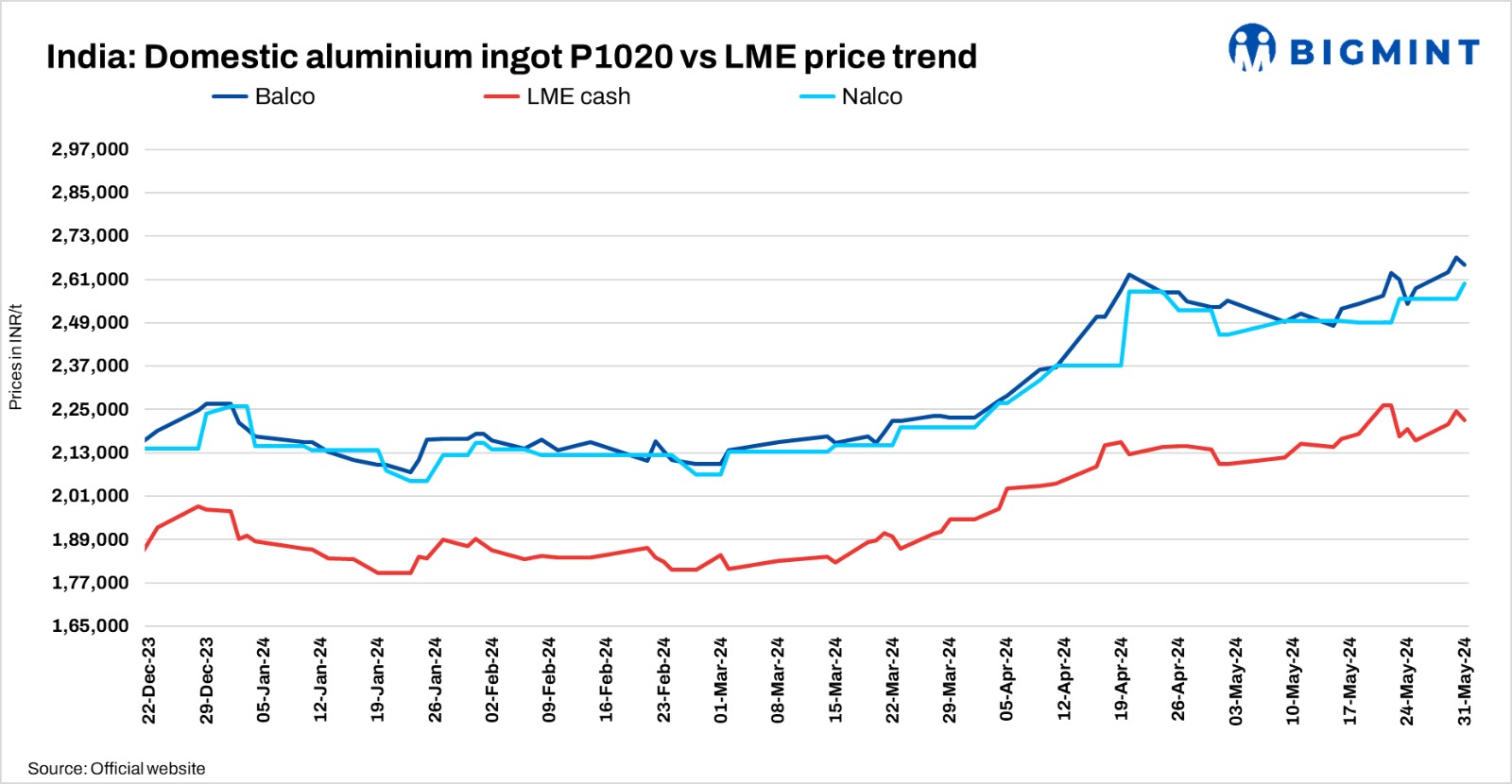 India’s primary aluminium producer, Nalco, has hiked ingot (P1020, 99.7%) prices by up to INR 4,200/t ($50/t) today. Nalco’s prices are at INR 259,900/t ($3,117/t) from INR 255,700/t ($3,067/t) on 23 May’24, prices are ex-works and exclude GST. At the time of reporting, aluminium futures on LME stood at $2,714/t.