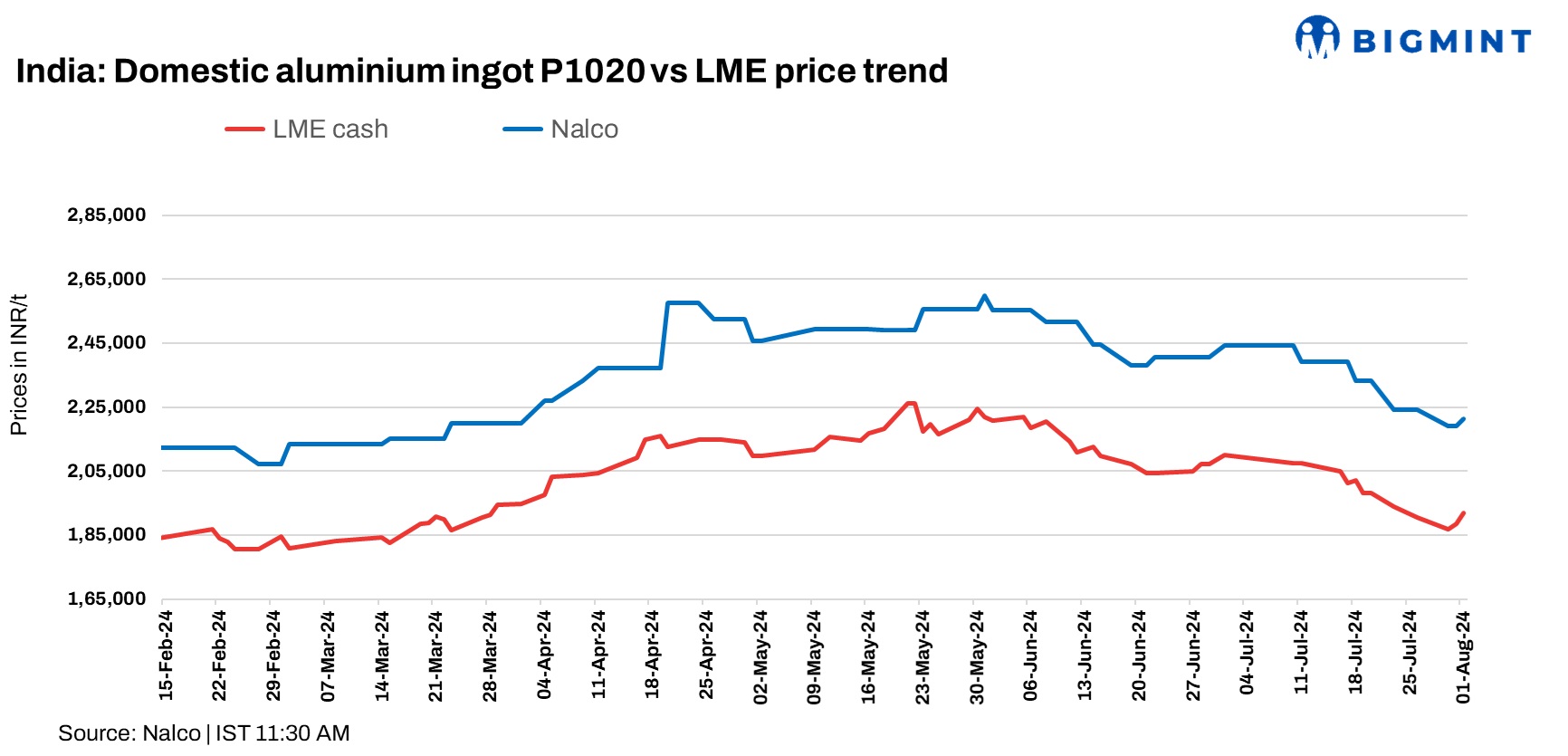 NALCO has increased the price of P1020 (99.7% ingot) by INR 2,300/t ($27/t) on 1 August 2024, after a consistent decline in price over the last few updates. NALCO’s prices are at INR 2,21,500/t ($2,654/t) from INR 2,19,200/t ($2,618/t) on 30 Jul’24. Prices are ex-works and exclude GST. At the time of reporting, aluminium futures on LME stood at $2,293/t.