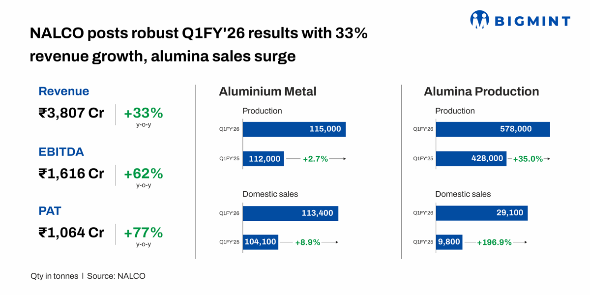 On the financial front, NALCO clocked revenue from operations of INR 3,807 crore in Q1FY’26, up 33% y-o-y. EBITDA (excluding exceptional incomes) rose 62% y-o-y to INR 1,616 crore, while profit after tax (PAT) jumped 77% to INR 1,064 crore, driven by volume growth and disciplined cost control.
