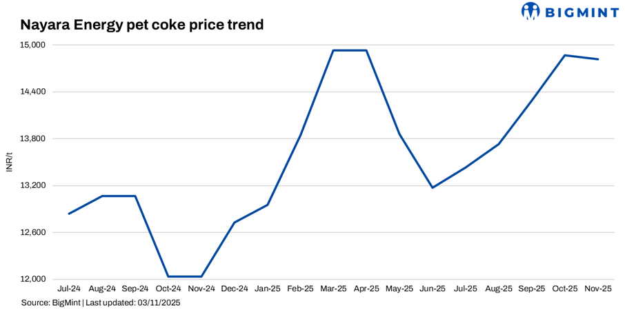 Nayara Energy Ltd (NEL) has reduced its pet coke prices to INR 14,820/t, w.e.f. 1 Nov’25, marking a marginal decline of INR 50/t (0.3%) from INR 14,870/t last month. The slight correction follows an INR 580/t hike in Oct’25. With RIL continuing to withhold price announcements since Apr’25, Nayara remains the key domestic supplier amid reduced output and tightening availability.