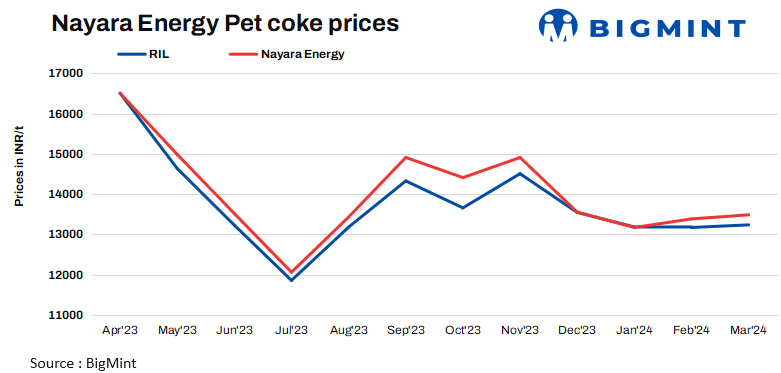 Nayara Energy has raised its pet coke prices by INR 102/t to INR 13,487/t for Mar’24 sales as against last month’s price of INR 13,385/t. The current month price is about 25.1% lower than price of same month last year. Nayara is the highest petcoke supplying company from a single refinery.