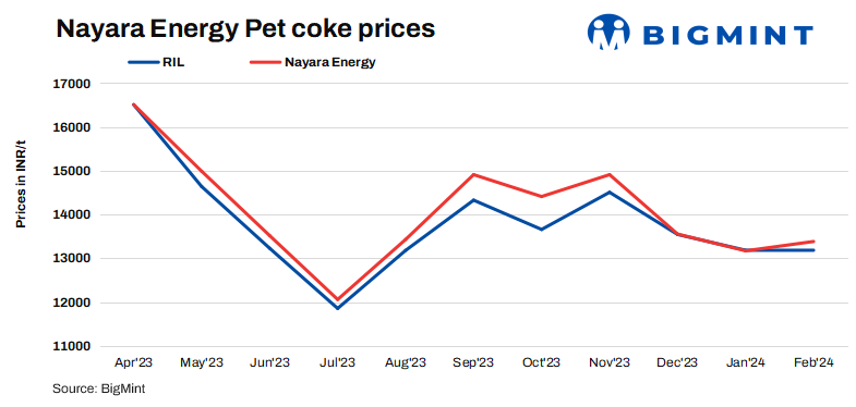 Nayara Energy has increased its pet coke prices by INR 200/t to INR 13,385/t for Feb’24 sales as against last month price of INR 13,185/t. The current month price is about 26% lower than price of same month last year. Nayara is the highest pet coke supplying company from a single refinery.