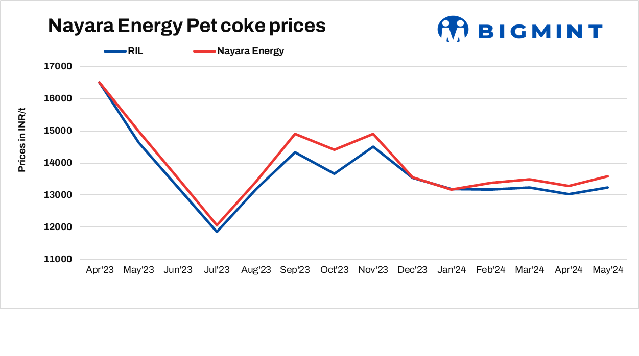 Nayara Energy has increased its pet coke prices by INR 310/t to INR 13,592/t for May’24 sales as against last month’s price of INR 13,282/t. The current month’s price is about 9.4% lower than price of same month last year. Nayara is the highest pet coke supplying company from a single refinery.