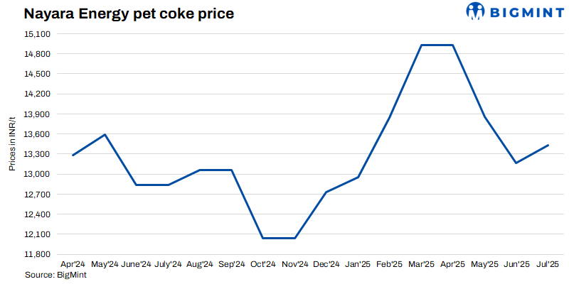 Nayara Energy has raised its pet coke price by INR 260/t to INR 13,430/t for Jul’25, up 2% over last month. The current price is also 4.6% higher than INR 12,842/t in Jul’24. RIL has not declared pet coke prices since Apr’25 as it uses its entire production internally, leaving Nayara as the top market supplier from a single refinery.
