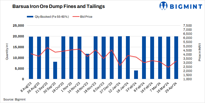 The Steel Authority of India Ltd (SAIL) conducted an auction for 19,920 t of iron ore tailings (Fe 58.24%- indicative) from its Barsua mines in Odisha on 29 Apr’24. According to sources, the entire quantity was booked at INR 3,200/t against the base price of INR 2,850/t. The price is on ex-mines basis and includes royalty, DMF, NMET, and additional premium.