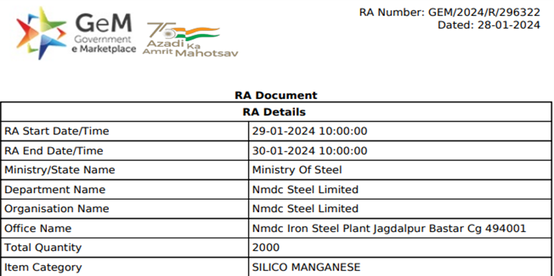 National Mineral Development Corporation (NMDC) concluded a reverse auction for 2,000 t of silico manganese (Mn: 60% min, C: 2% max, 25-50 mm) on 30 Jan’24. The entire material was booked at around INR 68,400/t FOR, excluding taxes, sources informed.