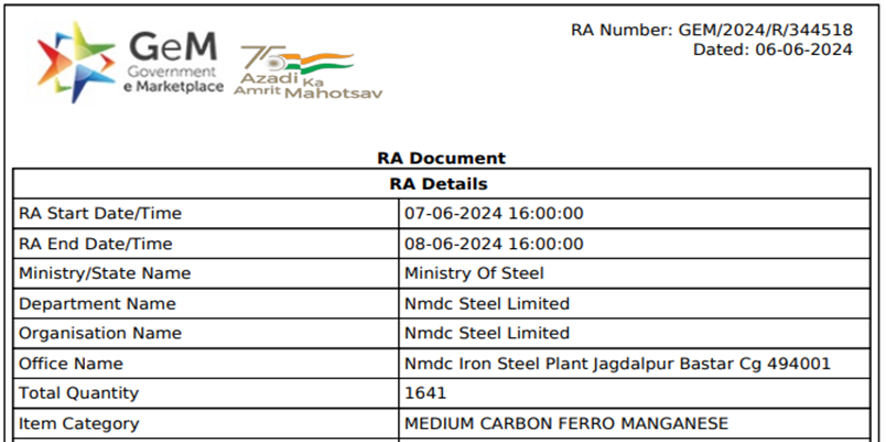 National Mineral Development Corporation (NMDC) concluded a reverse auction for 1,641 t of medium-carbon (MC) ferro manganese (Mn: 70% min, C: 3.0% max, 20-50 mm) on 8 Jun’24. The entire material was booked at around INR 95,600/t FOR, inclusive of taxes.