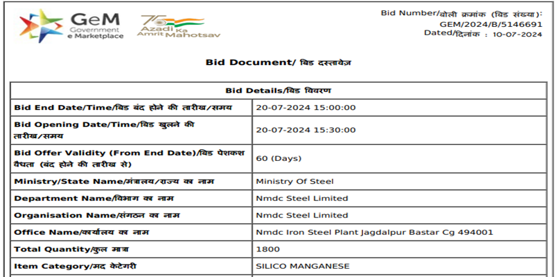 The National Mineral Development Corporation (NMDC) has invited bids to procure 1,800 t of silico manganese (Mn: 60% min, size: 25mm-50mm) for its Jagdalpur-based plant. The last date for bid submission is 20 Jul’24 and the bid is valid for 60 days from the end date. The highest-priced bid elimination is applicable for the reverse auction qualification rule.