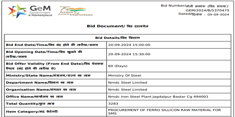 The National Mineral Development Corporation (NMDC) has invited bids to procure 3,283 t of ferro silicon (Si: 70%, size: 25mm-50mm) for its Jagdalpur-based plant. The last date for bid submission is 20 Sep’24 and the bid is valid for 60 days from the end date. The highest-priced bid elimination is applicable for the reverse auction qualification rule.