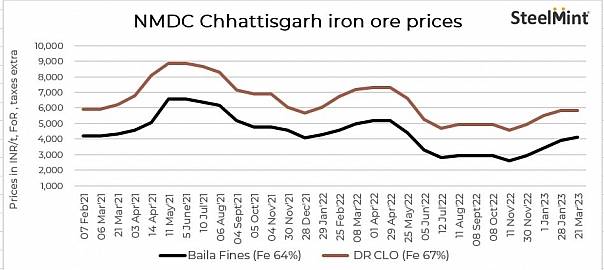 NMDC fixed prices for DR CLO (Fe 67%, 10-40mm) at INR 5,820/t and iron fines (64% – 10mm) at INR 4,110/t (FoR prices from Bacheli complex, excluding royalty, DMF and NMET) with effect from 21 Mar’23.