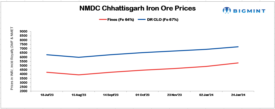 India’s largest merchant iron ore mining company, NMDC, increased list prices of iron ore today, BigMint learnt from reliable sources. The company has increased prices of DR-CLO by INR 300/tonne (t) and fines by INR 400/t, effective 24 January 2024.