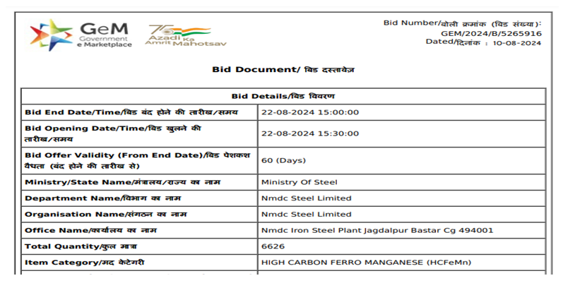 National Mineral Development Corporation (NMDC) has invited bids to procure 6,626 t of ferro manganese (Mn: 70% min, 25-50 mm) for its Jagdalpur-based plant. The last date for bids submission is 22 Aug’24. BigMint assessed ferro manganese (Mn:70%, 25-150 mm) prices at INR 75,600/t exw-Raipur on 12 Aug’24.