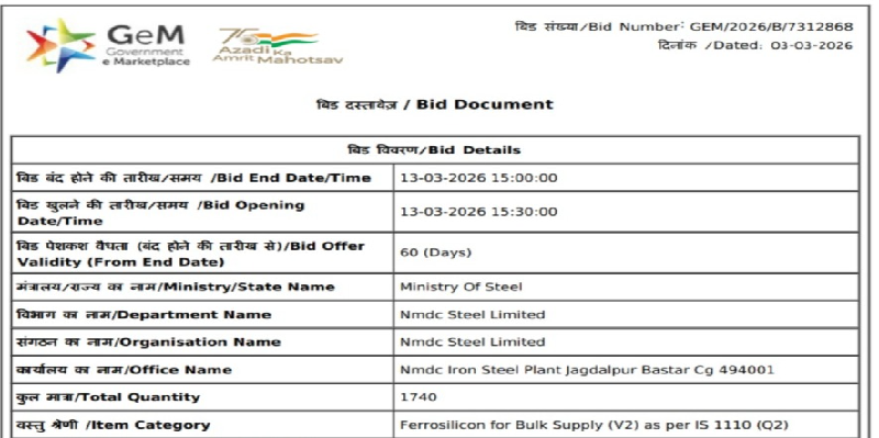 NMDC Steel Limited has floated a purchase tender to procure 1,740 t of ferro silicon (Si: 70% min, 25-50 mm) for its Jagdalpur-based unit. The bid submission deadline is 13 Mar’26, with bid offer validity of 60 days from the closing date. BigMint assessed ferro silicon prices (Si 70%, 25-150 mm) at INR 101,000/t ($1,099/t) exw-Guwahati on 6 Mar’26.