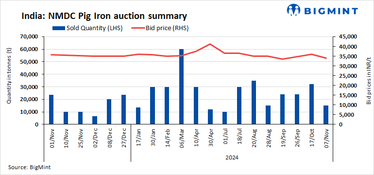 NMDC’s steel plant in Nagarnar, Chhattisgarh, conducted an auction for 30,000 t of steel-grade pig iron on 7 Nov’24. Out of 30,000 t, 15,000 t were booked at an average price of INR 34,000/t. However, management approval is still pending.