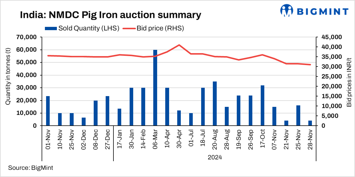 On 28 Nov’24, NMDC’s Nagarnar steel plant conducted an auction for 32,000 t of steel-grade pig iron at a base price of INR 31,000/t. However, only 4,000 t were booked at an average price of INR 31,000/t. In the previous auction, on 25 Nov’24, 16,000 t were booked at an average price of INR 31,500/t.
