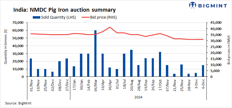On 6 Dec’24, NMDC’s Nagarnar steel plant conducted an auction for 20,000 t of steel-grade pig iron at a base price of INR 31,000/t. Of the offered volume, 15,000 t were booked at the base price. In the previous auction, on 3 Dec’24, only 5,000 t were booked at an average price of INR 31,000/t.
