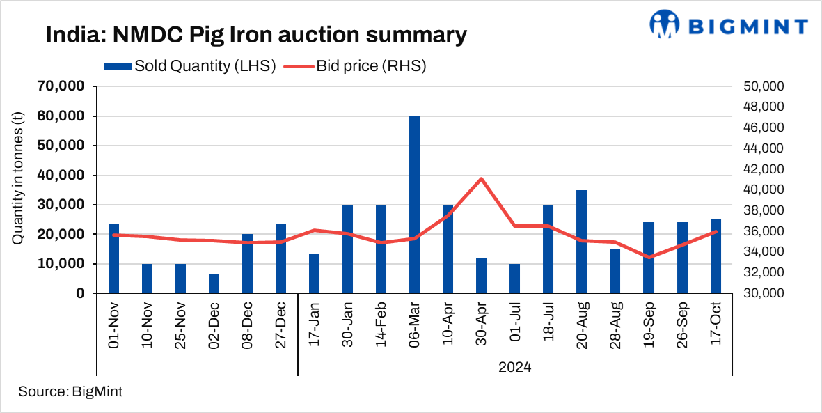 NMDC’s steel plant in Nagarnar, Chhattisgarh, conducted a steel-grade pig iron auction for 32,000 t on 17 Oct’24. Out of 32,000 t, 25000 t were booked at an average price of INR 36,000/t. However, management approval is still pending. In the previous approved auction, held on 26 Sep’24, the entire quantity was booked at an average price of INR 34,700/t.