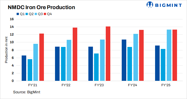 - Iron ore production dips in FY’25: The company reported FY’25 production at 44 mnt, down 2% y-o-y against 45 mnt in FY’24. However, iron ore production in Q4FY’25 inched up 1% y-o-y to 13.31 mnt despite logistical challenges during the quarter.