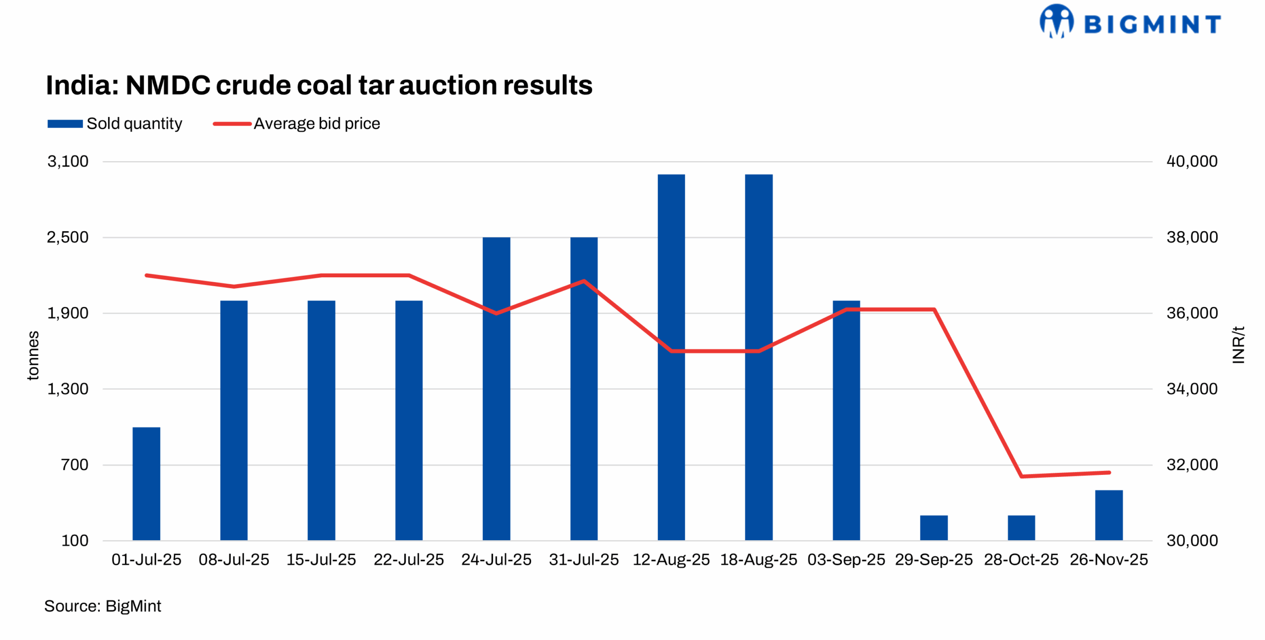 NMDC Steel Limited, Nagarnar is set to auction 500 tonnes (t) of crude coal tar on 23 Dec’25. In the previous auction held on 26 Nov’25, 300 t were auctioned, where complete quantity was sold out at a weighted average price of INR 31,800/t, increasing INR 100/t from the previous auction held on 28 Oct’25.