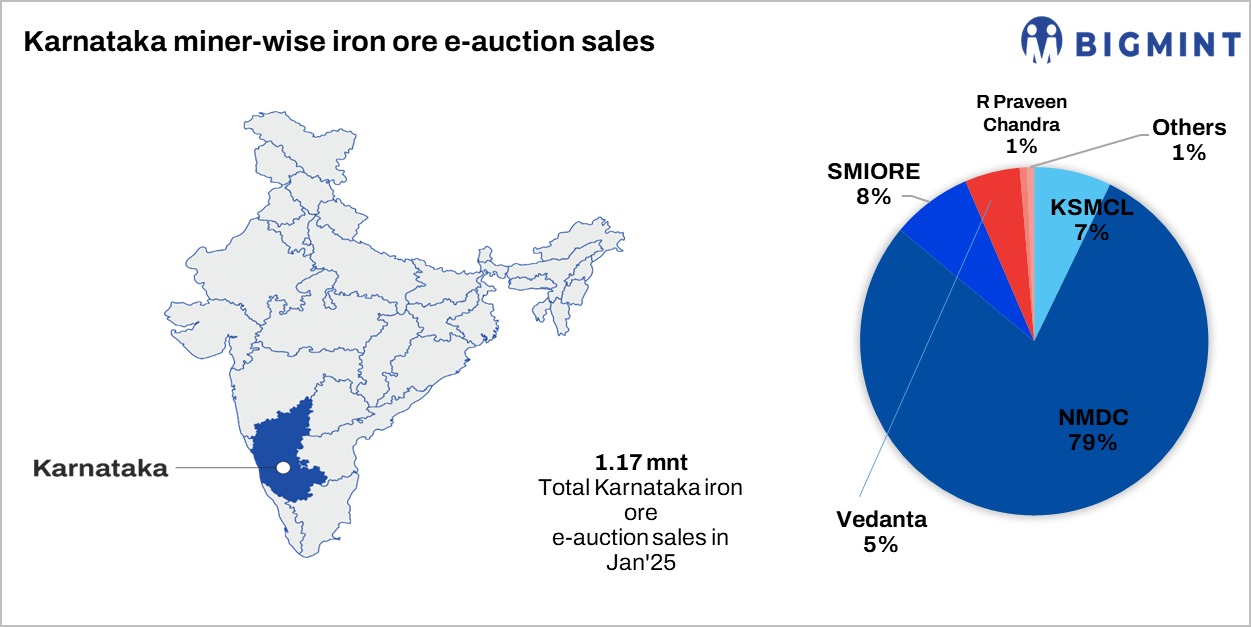 NMDC has scheduled an auction for 276,000 t of iron ore from its Kumaraswamy mines in Karnataka on 4 Mar’25. The total quantity includes 96,000 t lumps (10-40 mm, Fe 59.79-60.78%) and 180,000 t fines (Fe 55.63-59.36%). Floor prices are yet to be announced which will be on ex-mines basis and inclusive of royalty, DMF, and NMET.