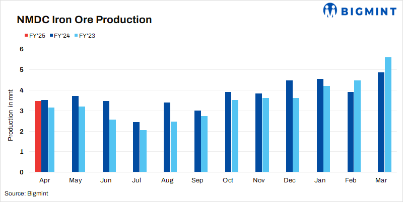 - NMDC, India’s largest iron ore producer, recorded output at 3.48 mnt in Apr’24, largely stable y-o-y as against 3.51 mnt in Apr’23.