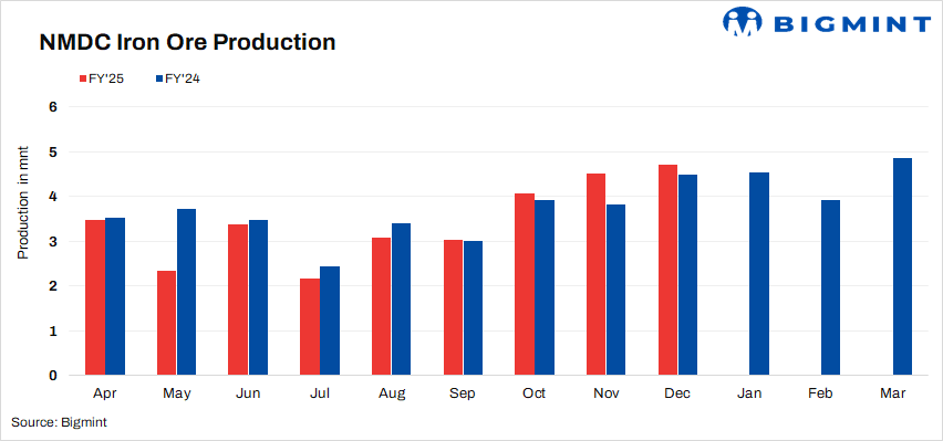 - Meanwhile, monthly iron ore output touched 4.71 mnt in Dec’24, up 4% as against 4.51 mnt in Nov’24.