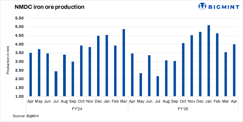 • NMDC’s monthly iron ore output touched 4 mnt in Apr’25, up by 13% from 3.55 mnt in Mar.