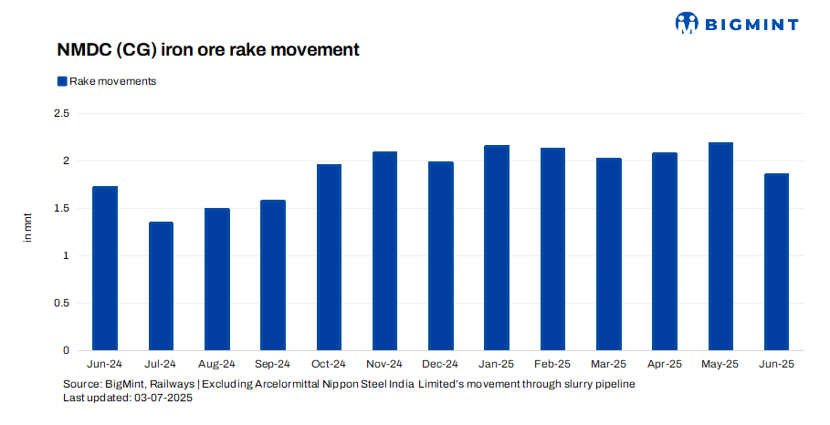 The National Mineral Development Corporation (NMDC), India’s largest iron ore miner, dispatched 481 rakes from its Chhattisgarh mines in June 2025, equivalent to 1.85 million tonnes (mnt) of iron ore. This was a drop of 15% compared to 566 rakes (2.18 mnt) in May 2025, as per BigMint data.