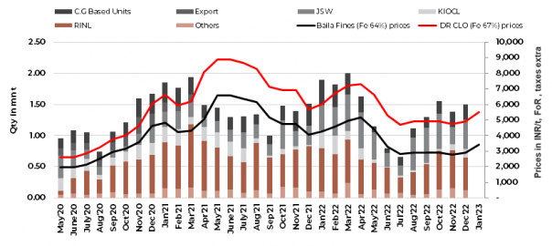 Sourcing by Chhattisgarh-based units edges up: NMDC’s iron ore rake movements to Chhattisgarh-based units were recorded at 63 in December compared to 62 in the previous month. Supportive market sentiments and the hike in sponge iron and billet prices kept iron ore sourcing from NMDC stable. For instance, the monthly average of SteelMint’s billet index was recorded at INR 44,200/t exw Raipur, up INR 1,300/t m-o-m.