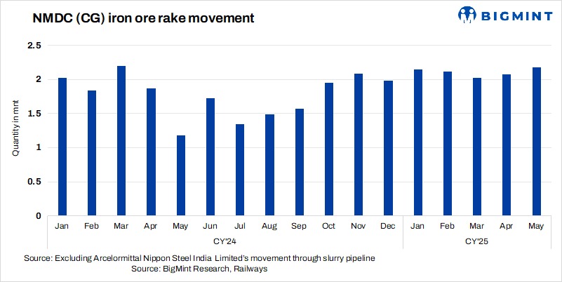 The National Mineral Development Corporation (NMDC), India’s largest iron ore miner, dispatched 566 rakes from its Chhattisgarh mines in May 2025, equivalent to 2.18 million tonnes (mnt) of iron ore. This was an increase of 5% compared to 538 rakes (2.07 mnt) in April 2025, as per BigMint data.