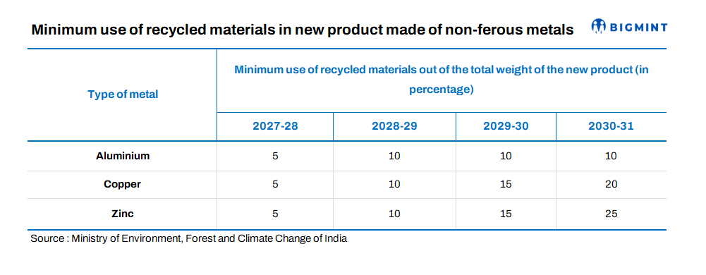Starting from FY’28, all new products made from non-ferrous metals will have to include a minimum of 5% recycled content. For aluminum, the recycled content must be 10%, for copper 20%, while for zinc it is 25%.