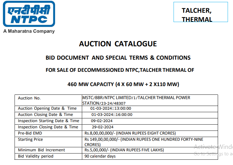 NTPC has announced an auction for the sale of the decommissioned Talcher Thermal Plant in Odisha, comprising units 1 to 4 with a capacity of 60MW each, and units 5 and 6 with a capacity of 110MW each. The auction is set to take place on 1 March, 2024, in Angul, Odisha. The plant ceased operations on 31 March, 2021, due to safety and environmental compliance issues.