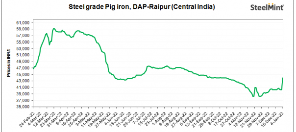 - Meanwhile, steel grade pig iron offers in the Durgapur market jumped INR 2,800-3,000/t w-o-w to INR 43,800-44,000/t exw.