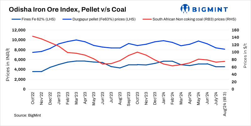 As per BigMint’s analysis, Odisha iron ore lumps prices may remain under pressure in the coming days due to falling steel prices in the past few days. However, the fines prices are expected to remain volatile due to tight availability in the rainy season along with pressure from pellet prices.