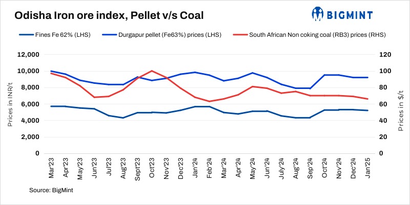 BigMint’s Odisha iron ore fines (Fe 62%) index fell by INR 200/t ($2.5/t) w-o-w to INR 5,000/t ($58/t) ex-mines on 18 January 2025. Overall, around 200,000 t of iron ore (fines and lumps) deals were recorded from Odisha this week.