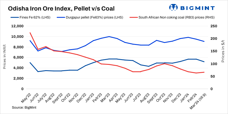BigMint’s weekly Odisha iron ore fines (Fe 62%) index decreased by INR 150/t ($2) w-o-w to INR 5,100/t ($62) ex-mines on 9 March 2024. A deal of 25,000 t higher grade fines from merchant miners was heard in this publishing window.