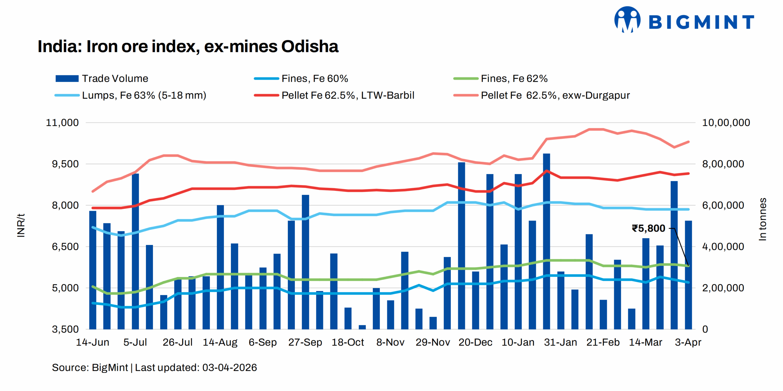 BigMint’s Odisha iron ore fines (Fe 62%) index decreased by INR 50/t w-o-w at INR 5,800/t ($63/t) ex-mines on Friday (3 April). It recorded deals for around 525,000 t this week, concluded directly by steelmakers with private miners and traders.