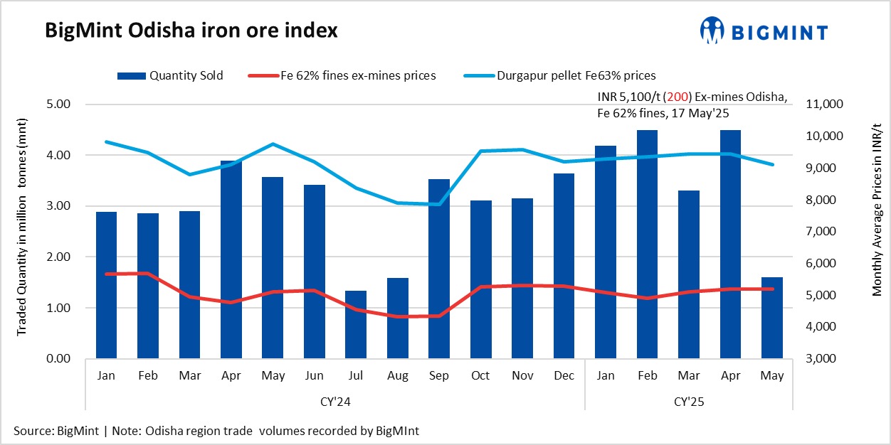 BigMint’s Odisha iron ore fines (Fe 62%) index fell by INR 200/tonne (t) ($2.5/t) w-o-w to INR 5,100/t ($60/t) ex-mines on 17 May. Around 50,000 t of higher-grade iron ore fines (Fe 62-65%) were traded in Odisha. Notably, deals for around 500,000 t of iron ore (fines and lumps) were recorded from Odisha this week, which were concluded at lower, discounted prices.