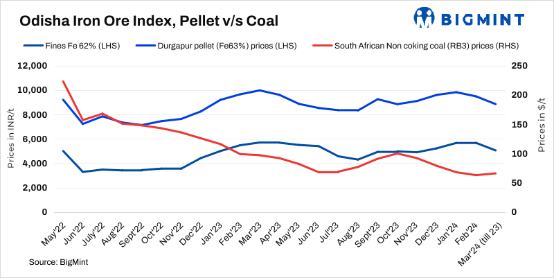 • Pellet offers fall in domestic, export markets: Pellet (6-20 mm, Fe 62.5%) prices in Odisha’s Barbil inched down by around INR 50/t ($1/t) w-o-w. The current assessment stands at INR 7,900/t ($94.5/t) loaded to wagon. Pellet (Fe 62.5%, 6-20 mm) prices in Durgapur fell by INR 350/t ($4/t) w-o-w to INR 8,500/t ($105/t) exw on 22 March. BigMint’s India pellet (Fe 63%, 3% Al) export index (FOB east coast) decreased by $1.5/tonne (t) to $96/t on 20 March 2024. The pellet export market dropped this week amid sluggish sentiment and lack of demand from Chinese buyers.