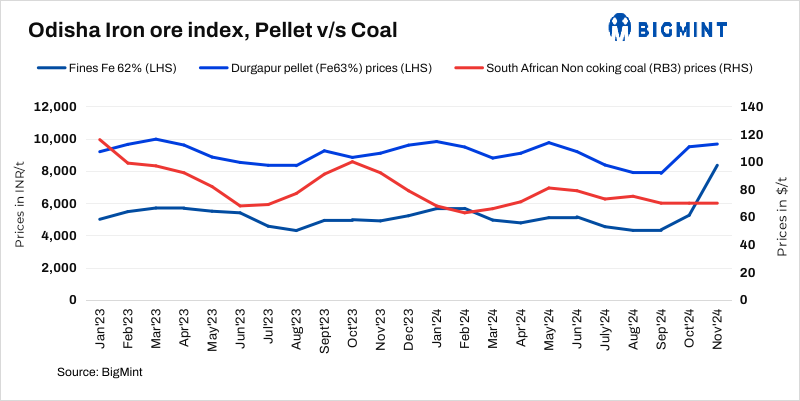 - Domestic pellet prices drop, exports up w-o-w: Pellet prices in the domestic and export markets remained under pressure this week. Pellet (6-20 mm, Fe 62.5%) prices in Odisha’s Barbil fell by INR 300/t ($4/t) w-o-w to INR 8,100/t ($96/t) loaded to wagon. Pellet (Fe 62.5%, 6-20 mm) prices in Durgapur inched done by INR 100/t ($1/t) w-o-w to INR 9,600/t ($114/t) exw on 22 November. BigMint’s India pellet (Fe 63%, 3% Al) export index (FOB east coast) rose by $3/t w-o-w to $92.5/t on 22 November.