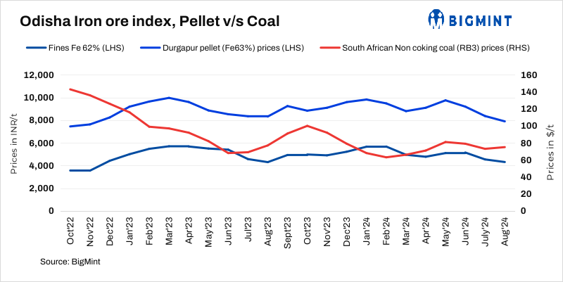 A pellet producer from Odisha said that pellet prices fell by around INR 200-300/t in central India, and currently, the profit margin is very low. This may put pressure on miners for a reduction in iron ore prices in the near term. However, some improvement in domestic steel prices may balance out the market dynamics with raw material prices.