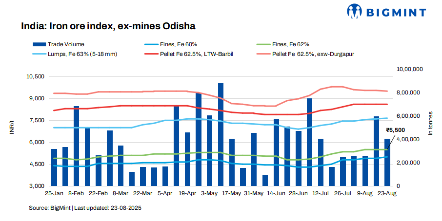 BigMint’s Odisha iron ore fines (Fe 62%) index remained stable w-o-w at INR 5,500/tonne (t) ($63/t) ex-mines on 23 August 2025. Deals for around 420,000 t were recorded by BigMint in Odisha, excluding the OMC auction.